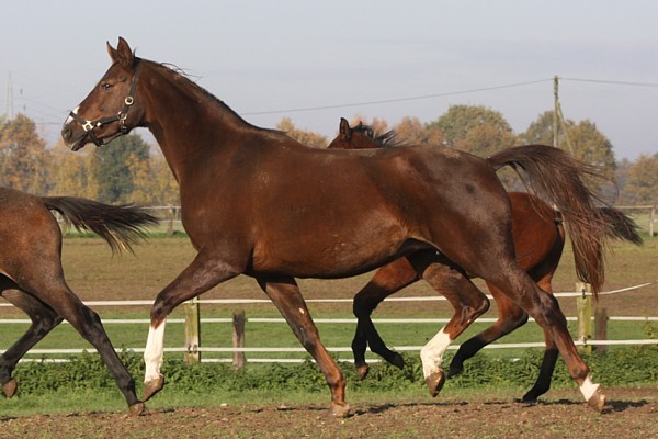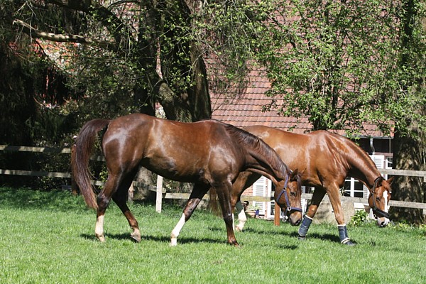 ![]() Mit 8,2 belegte Steffi selbst in dieser Prüfung den dritten Platz auf der fünfjährigen KWPN-Stute Filinda, für die es der erste Start in L überhaupt war. Filinda verdient besondere Erwähnung auf diesen Seiten, steht sie doch quasi als Patin für den kleinen Zampano. Filinda war es, die als eine der besten dreijährigen Stuten in den Niederlanden Johann Hinnemann im letzten Frühjahr aufgrund ihrer Abstammung von Zhivago x Fidermark zu seiner Anpaarungsidee von Deauville an Zhivago inspirierte. Mit Fug und Recht darf man also behaupten: ohne Filinda gäbe es heute den kleinen Zampano nicht. Verständlich also, dass mir Filinda's sportlicher Werdegang unter dem Sattel sehr am Herzen liegt und diesen gelungenen Doppelerfolg von Steffi, Marina, Bunny und Filinda an diesem Wochenende zu einem ganz besonderen Erfolg für die Münsterland-Pferde und mich macht. ![]() Turnierstress einmal anders: Sonnenbad mit Bunny! ![]() Danke, Borken Live, für diesen gelungenen Schnappschuss! 29.5.2015 Bravo, Marina! Die Schlagzeile drängt sich einfach auf an diesem Wochenende, das Marina und Bunny (Sportname: Bravo) ihren ersten gemeinsamen Sieg in "M" beschert! Mit der M3 stand eine anspruchsvolle Dressurpferdeprüfung in Düren auf dem Programm, die vier fliegende Galoppwechsel fordert. Das mag auch der Grund sein, weshalb die ansonsten reich bestückten Teilnehmerfelder in Düren sich gerade in dieser Prüfung etwas schmal ausnahmen. Umso schwerer wiegt die Herausforderung, der Bunny und Marina sich unter der Fittiche von Steffi, die das Paar erneut erfolgreich coachte, in Düren stellten. Das Motto lautete: "Entspannt nach vorn!" und genau so entschieden Bunny und Marina ihre erste Dressurpferde M überzeugend mit einer 7,8 für sich. Merke: vier Wechsel können auch von grossem Vorteil sein weil man gleich vier Mal die Gelegenheit bekommt, sich zu beweisen! Ganz herzlichen Glückwunsch Marina, Bunny und auch Steffi, die als engagierter Ausbilder offensichtlich alles richtig macht. Ich bin stolz auf euch und freue mich wie verrückt über diesen ersten M-Erfolg meiner Bunny! 18.6.2015 Rheinische Meisterschaften Langenfeld Platz drei für Bunny und Marina in der Dressurpferde M in Langenfeld in wohl geordneter Konkurrenz hinter Jana Freund auf Bodyguard und Ausbilderin Steffi Wolf auf Saphira Royal NG - herzlichen Glückwunsch, Bunny und Marina! ![]() 2.10.2015 Bunny und Marina in Kirchhellen Was für ein gelungener, berufstätigenfreundlicher Freitagnachmittag bei strahlendem Sonnenschein in Kirchhellen! Platz drei für Bunny und Marina in der Dressurpferde M, für mich war es der gefühlte Sieg und die schönste Bestätigung dessen, was mich in den letzten Wochen bereits im Training immer wieder begeistert hatte. Die ersten Serienwechsel, die ersten gross angelegten Arbeitspirouetten, Traversalen, die deutlich an Schwung dazu gewinnen und ein ungemein ästhetisches Paar dazu, sichtbar auf dem richtigen Weg. Und wie das so ist, wenn man mitten im Geschehen dabei ist: Wenn die sponatnen Kommentare am Viereck sich mit den eigenen Eindrücken decken, dann bekommt man das Grinsen gar nicht mehr aus dem Gesicht... Leichtfüssig, dynamisch und Blickfang wie eh und je und ich konnte mich nicht losreissen von diesem Bild auf dem Abreiteplatz und in der Prüfung, das war einfach schön! ![]() Auf dem Weg zurück zum Anhänger leistet eine knackige Bunny sich dann gern einen beeindruckenden Luftprung, den Marina mit einem breiten Grinsen quittiert. Bocksprung ausdrücklich erlaubt, Honey-Bunny kann das wirklich gut und weiss, wann die rechte Zeit dafür ist - so macht Dressurreiten Spass! Danke, Marina, wieder einmal! ![]() 9.4.2016 Bunny ist wieder in Münster! Deauville hat Bunny's Box auf dem Krüsterhof bezogen und Bunny wird in diesem Frühling erneut gedeckt. Ich freue mich jeden Tag darüber, dieses herrliche Pferd neben Silas im Stall und auf der Wiese zu sehen! Es ist nun Silas' Aufgabe Bunny eine gute Rosse zu bescheren, so lange bleibt sie hier in Münster und ich reite sie selber und habe meinen grossen Spass daran. Bunny ist und bleibt mir das liebste Fabricenkind und ich bin glücklich, sie bei mir zu wissen. 24.4.2016 Romy zu Besuch in Münster! Schon seit langem wollte Romy ihren "virtuellen" Liebling Carly einmal life auf dem Hof Altepost besuchen. Als Bunny dann vor ein paar Wochen den Krüsterhof verlassen hat und Romy sie sehr vermisst, hatte sie nun doppelt guten Grund für ihren Besuch in Münster - liebe Romy, ich hoffe, es bleibt nicht dein letzter Besuch! Wir hatten viel Spass mit Bunny und Silas im Gelände und ich war begeistert, wie lässig Bunny auf Anhieb mit Romy im Sattel die Sprünge auf dem Platz angenommen hat! Hier hat sie vor vier Jahren im zarten dreijährigen Alter ihre ersten kleinen Sprünge beim anreiten mit mir absolviert. Damals stand uns in Gerrit Nieberg ein famoser Helfer an den Stangen zur Seite. Heute haben wir die Rollen getauscht und ich habe nur zu gern die Rolle des "Kurschefs" übernommen und hatte die helle Freude an meiner Bunny unter Romy! Danke, Dominik, für die schönen Fotos! ![]() ![]() ![]() 15.5.2016 Favouritensterben und der ganz persönliche Züchterwahnsinn Seit über acht Wochen ist meine Bunny nun wieder zu Hause und als ich sie im März vom Krüsterhof abholte war der Plan: ein paar Wochen hier zu Hause in Münster reiten und mit Silas zusammen auf die Wiese, der soll sie zügig rossig machen und dann wird besamt! Hengstideen hatte ich reichlich im Kopf und ich war sicher, bis der erste Follikel steht wusste ich auch, was ich wollte. Der Ideentopf brodelte über, die Reihenfolge ergab sich wie folgt: 1. Fortunatus, der gefällige Schimmel aus Celle von der letzten Körung in der begehrenswerten Kombination aus Fürst Heinrich und doppeltem Sir Donnerhall, die mir aus diversen Gründen sehr zusagte. Unter dem Sattel hatte der Hengst mich dann später in Verden ebenso nachhaltig überzeugt. 2. Don Frederic, weil Bunny's erste Tochter