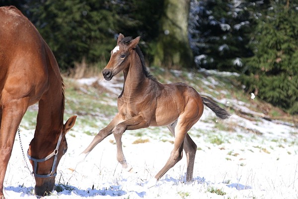 | Mutterstamm: Mutter Fannie Mae war Prämienfohlen a.d. Fohlenschau Heinsberg, Juli 2003 - Silbermedaille SLP Telgte, 13. Juni 2006 - Platz 2/21, Wertnote 7,97 Einzelnoten: Trab 8,0 Galopp 8,5 Schritt 7,5 Rittigkeit Richter 8,0 Rittigkeit Fremdreiter 8,5 Freispringen 7,5 Eintragung in das Hannoversche Hauptstutbuch, 11. August 2011 - Einzelnoten u.a. dreimal die 8, darunter für ihren hervorragenden Schritt - die verdiente Anerkennung im Hinblick auf ihr überdurchschnittliches SLP-Ergebniss, dessen unangebrachte Schrittbeurteilung sie seinerzeit den überlegenen Sieg in dieser Prüfung mit einer Gesamtnote deutlich über 8 gekostet hat. Fannie Mae (Hengstmutter) ist die fünfte von 5 Vollgeschwistern von Fidermark, die alle mit der Fohlenprämie ausgezeichnet wurden, darunter Auktionsfohlen. Vollbruder Fair Play*2002 Rheinischer Reitpferdechampion 2005 Vollschwester Fabrice*1998 FN Leistungsstutbuch C -Nachzuchterfolge- SLP Telgte Platz 1, Wertnote 8,39 Einzelnoten: Trab 8,5 Galopp 8,5 Schritt 8,0 Rittigkeit Richter 9,0 Rittigkeit Fremdreiter 8,5 Freispringen 8,0. Detaillierte Infomationen zu der sporterfolgreichen Nachzucht aus Fabrice finden sich auf ihrer Seite. Vollschwester "Miss Feeny" (Auktionsfohlen) ist Mutter zu Fantastic Sommertänzer von Samarant, 5-jrg Bundeschampionat Drpf, 6-jrg M-Drs gewonnen Vollschwester "Miss Feeny" ist Mutter zu Fantastic Snoop Dog von San Amour (Heiner Schiergen), St.Georg Special gewonnen, Intermediare-I 2. Vollschwester "Miss Feeny" ist Mutter zu Fantastic Sugar Candy von San Amour, Dressurpferde A gewonnen, Dressurpferde L platziert. sowie Ripito L von Riccione a.d. Piroschka von Pit a.d. Feodora von Frühlingsball, M-Dressur, DrPF M intl/LUX Detaillierte Informationen zum Ursprung und weitergehenden Stutenstamm finden sich auf der Seite Stutenstamm. Nachzucht Fannie Mae: 01.Februar 2007 - Hengstfohlen von Sir Donnerhall - "Sansibar" gekörter Hengst (Paul Schockemöhle, aktuell Helgstrand Dressage), mehrfacher S-Sieger 11.April 2008 - Stutfohlen von Sir Donnerhall - Sawadee (verkauft, Ndl.) 06.Juni.2009 - Stutfohlen von Rohdiamant - Rarität (Riva) - verkauft als Zuchtstute 05.Mai 2010 - Hengstfohlen von Real Diamond - Rialto Venice (verkauft, Reitpferdeprüfung und Dressurpferde A erfolgreich) 12.April 2011 - Stutfohlen von Don Schufro - Deauville - eigene Aufzucht, gedeckt (Zampano), Dressurpferde A gewonnen, Dressurpferde L 3. 24.März 2012 - Hengstfohlen von Don Schufro - Dago (verkauft) 17.März 2013 - Stutfohlen von Rock Forever - Rapunzel (verkauft, Aufzucht auf dem Hof Altepost) 20.März 2014 - Hengstfohlen von Rock Forever - Rasputin (verkauft in Hengstaufzucht, gekört) 09.März 2015 - Hengstfohlen von Elton John - E.J. Junior verkauft, Reitpferdeprfg gewonnen, Dressurpferdeprüfung platziert 16.Februar 2016 - Hengstfohlen von Diatano - Dubai (verkauft in Hengstaufzucht) 26.Februar 2017 - Stutfohlen von Bencio - Butterfly - eigene Aufzucht, angeritten und gedeckt Sommer 2020 12.Februar 2018 - Hengstfohlen von Benicio - Kunterbunt (verkauft in Hengstaufzucht) 2019 tragend von Benicio - verfohlt 27.Januar 2020 - Stutfohlen von Benicio - Ein zauberhaftes Bienchen - eigene Aufzucht 17.Januar 2021- Hengstfohlen von Morricone - Morris (verkauft in Hengstaufzucht) 2022 nicht tragend 5.2.2023 -Stutfohlen von Vaderland -Victoria Gedanken zur Hengstwahl: warum Vaderland? |