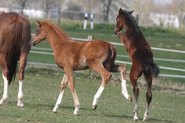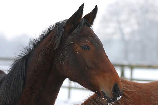 ![]() ... argloses Anschleichen und -zack!- sitzt der kleine Schalk im Nacken! ![]() 22.3.2020 Ein Unglück kommt selten allein ... Als Stutenfee Ingrid nach Telgte fuhr, um Fabrice nach Hause zu holen, nahm sie Carly und Caro Lee gleich mit. Das Fohlen hatte sich einen nachhaltigen Durchfall zugezogen, dem wir zu Hause bei aller Mühe und Behandlung nicht Herr wurden. Jahrelange Erfahrung mit jungen Fohlen hatte Ingrid gelehrt, dass man in solchen Fällen nicht zu lange abwartet, sondern besser rechtzeitig handelt. Sie sollte einmal mehr Recht behalten. Ein hartnäckiges Bakterium im Darm hatte man schnell identifiziert und erfolgreich bekämpft. Doch wie das so ist: Das eine zieht das andere nach sich, und Caro Lee zog sich eine böse Infektion zu. Aus der geplanten Woche in der Klinik wurden zwei, und banges Warten machte die Sache nicht einfacher. Vor Ostern gab es dann die ersehnte Entwarnung und grünes Licht für Mutter und Kind: Carly und Caro Lee durften wieder nach Hause! Ich kann nicht beschreiben wie dankbar und erleichtert ich war, als ich mit Carly und Caro Lee erstmals wieder in den Wald spazierte. Das junge Fohlen lebenslustig an Mutters Seite um die Bäume hüpfen zu sehen, war das schönste Geschenk. Gleichwohl bin auch ich inzwischen aus Schaden klug geworden. Diese Rechnung habe ich noch nicht geöffent ... 17.1.2021 Sonntagmorgen und Schnee in Münster - wann hat es das das letzte Mal gegeben? Im zarten Jährlingsalter kann man einiges an so ein junges Pferd heran dichten. Doch der Vergleich zu ihrem Vollbruder Karlchen im selben Alter könnte gravierender nicht ausfallen: Caro Lee ist sichtbar blutgeprägt und steht auf dem filigranen Blüterfundament ihrer Grossmutter Ionia xx, meinem Igelchen. Man muss das Erbe des Acatenango xx drei Generationen zurück nicht beschwören, doch ihre Grossmutter kann sie wahrlich nicht leugnen. ![]() Caro Lee war die erste unter den Jährlingen, die Möhrchen frass. "Das habe ich nur einmal versucht, seither krabbelt sie mir jedes Mal in die Tasche und ich werde sie nicht mehr los!", tönte Stutenfee Ingrid eines Tages im Herbst mit einem Lachen. Ich grinste still vor mich hin. "Möhrchenschnipsel" hatte ich mit Caro Lee schon seit Ladybird geübt ... Ein strubbliger Jährling und je nach Guck ein bisschen Capistrano, ein bisschen Carly. Vererbung ist eben doch ein Autobus voller Verwandtschaft, und man weiss nie wer als erster aussteigt. ... oder noch hinten drin sitzen geblieben ist. ![]() 10.5.2023 Ein Schuss - ein Treffer! Ganz wie ihre Mutter Carly im letzten Jahr ist auch Caro Lee mit einer einzigen Besamung von dem Celler Mädchenfänger Grey Boulevard tragend. Gern habe ich mich wieder selbst zu einem Plausch auf der Deckstelle auf den Weg nach Ankum gemacht, um so den Samen dann morgens auch frisch in die Sute zu bringen. Es hat sich gelohnt! Wobei das "frisch in die Sute bringen" so selbstverständlich nicht war ... Man vergisst schnell, dass eine dreijährige Erstlingsstute nichts kennt. Deckstand und Besamung sowieso nicht. "Einzelhaft" auch nicht. Das muss auch nicht sein. Die Jungstutenherde sollte eigentlich schon Tag und Nacht draussen sein, Caro Lee`s wegen liefen die Damen jedoch noch im Laufstall und auf dem Paddock. Caro Lee allein für jede Follikelkontrolle und Ultraschall aus der illustren Herde von der Weide zu fischen, wäre gar nicht gegangen. Den Weg am Halfterstrick allein aus dem Laufstall von ihrer Herde weg auf die Tenne bis in den Besamungsstand liess sie sich noch gefallen. Dann war aber auch Schluss mit lustig und ich konnte Sutenfee Ingrid gut verstehen, als sie mir nachdrücklich zu Verstehen gab, ich könne jetzt aber nicht gleich wieder in den Kia springen um ins Büro zu fahren. Zwei Leute bräuchte es schon zur Besamung ... Ah! Fast Forward drei Wochen später: "Deine Caro Lee war heute ein Musterbeispiel von einem braven Pferd beim Schmied. Sowas von kuschelig, brav und gehorsam! Die kann eigentlich nur tragend sein ...!" So war es dann auch. Und wer die subtile Tonspur rausgehört hat merkt gleich, Caro Lee ist nicht unbedingt die beste Freundin meiner Stutenfee .... Attribute wie eigensinnig, selbstbewusst und griffig hatte ich schon desöfteren zu hören bekommen. Stutenfee Ingrid verfügt über einen bunten Strauss von Tonspuren und Worten, meine mitunter etwas eigenwilligen Rösser treffend zu beschreiben. In diesem Falle klingen ihre Worte einmal mehr wie eine grosse Verheissung in meinen Ohren, denn Butterfly hat sie seinerzeit ähnlich "gern" gehabt und war froh, als ich damals mit ihr zum Anreiten vom Hof rollte. Und ich muss schon wieder lachen, während ich das schreibe .... Butterfly avancierte damals zügig zu meinem Liebling im Stalll und unter dem Sattel - ein gutes Omen! Die dreijährige Caro Lee ist in diesem Jahr also die erste tragende Stute im Bunde, und ganz bewusst gilt auch bei dieser Anpaarung: Blut zu Blut! Die Anpaarunug mit Grey Butt lag einfach auf der Hand, nachdem Mutter Carly aktuell mit dem kleinen Galopper einen hinreissenden Sohnemann bei Fuss führt, der gern ein Stutfohlen hätte werden dürfen. Der kleine Galopper ist ein Ebenbild seines Vaters in Silouhette und Aufmachung und wird vermutlich in den prägenden Quadrattyp beider Eltern reifen. Caro Lee ist rahmiger als Carly und steht auch deutlich mehr im Rechteck als Carly, den Capistrano sieht man ihr bereits jetzt deutlicher an als ihrem Vollbruder Karlchen, der noch heute im Alter von fünf Jahren über sehr viel mehr "luftigem" Boden steht als seine dreijährige Schwester. Möglicherweise ist Caro Lee also Dank des offensichtlich väterlichen Einfluss des Capistrano in der Lage, den quadratischen Typus ihrer Mutter und des Grey Butt in Rechteck und Rückenlänge zu strecken. Karlchen und Caro Lee verfügen über einen Vollblutanteil von 43 Prozent. In konventioneller Warmblutanpaarung geht dieser Einfluss ruckzuck wieder verloren. In Anpaarung an den hoch im Blut stehenden Grey Butt mit seinen 60 Pro