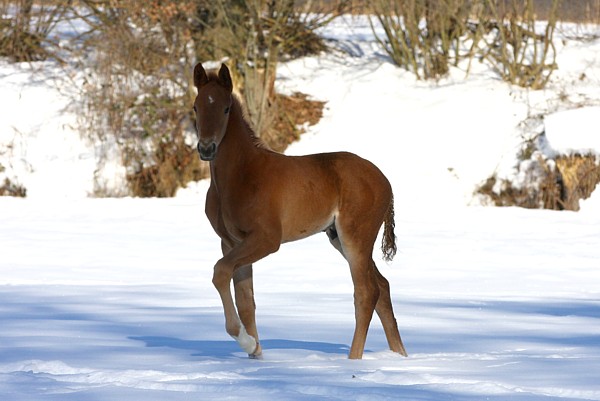 | Wir spazieren derweil gelassen mit Fannie Richtung Wald, irgendwann kommt Morris von hinten angeflogen und springt die Böschungen hoch zu den ersten sagenhaften Spurts durch den Wald und um die Bäume. Von diesem Bild kann ich einfach nicht genug bekommen! Es gibt nichts schöneres, als ein junges Fohlen ausgelassen in Hochgeschwindigkeit um die Bäume brausen zu sehen, meist endet der berauschende Slalom dann in einer ebenso berauschenden Galopptour durch das tiefer liegende Brachland, mit hohen Sätzen über die Grasbüschel. Mit seinen knapp zwei Wochen im tiefsten Winter dürfte Morris das am besten konditionierte und vor allem flug- und springfesteste Fohlen seines mitteleuropäischen Jahrgangs sein. Dreimal am Tag eine solche Tour macht jetzt schon einen echten Sportler aus dem knackigen Kerl. Muskelpack und "Fannie Sahne" gibt reichlich her ... | ||